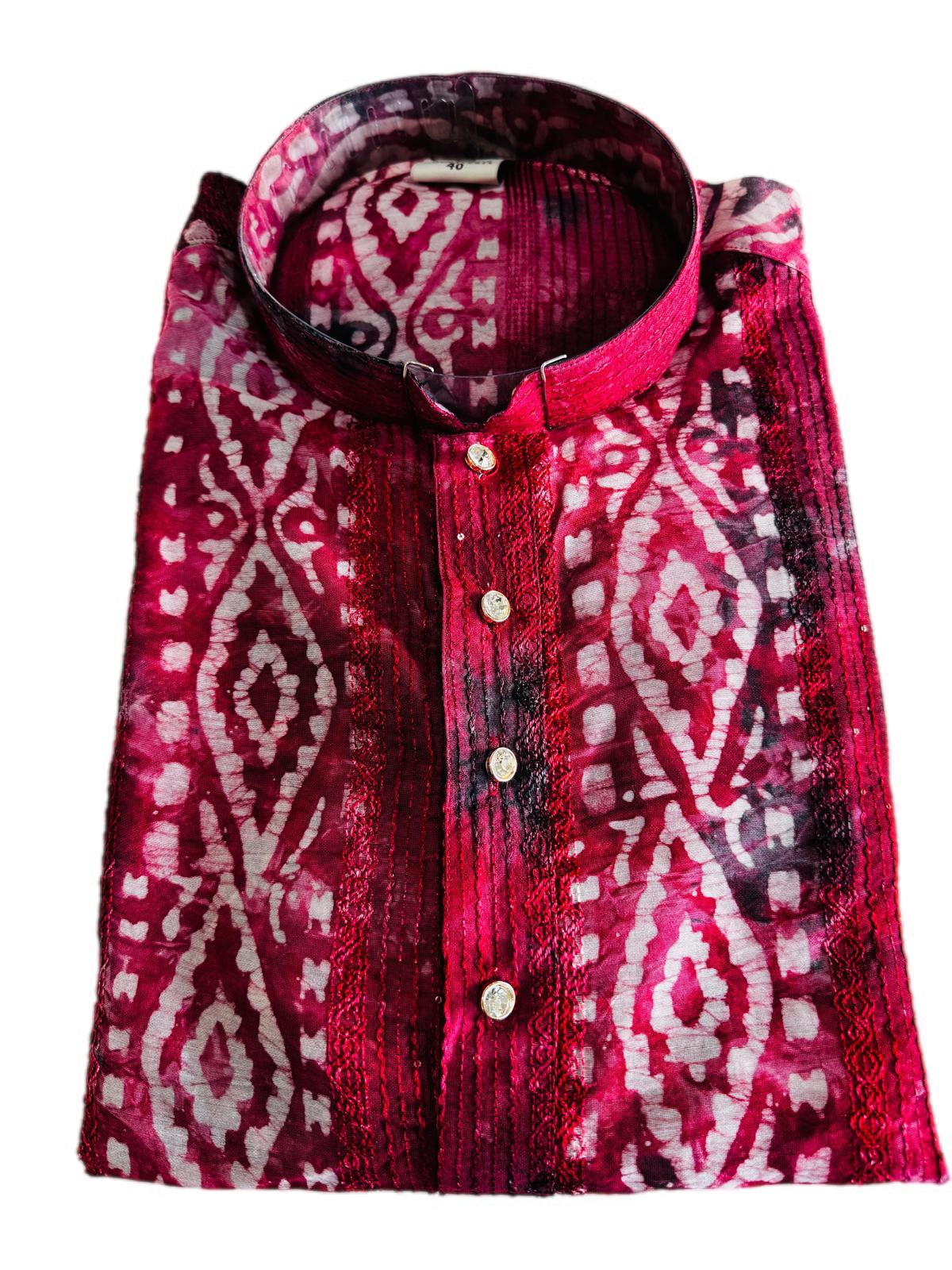 - The Kurta: Premium Soft-Touch Cotton-Blend featuring organic, hand-dyed batik patterns in Crimson Bloom. Each piece offers a "one-of-a-kind" artisanal character.